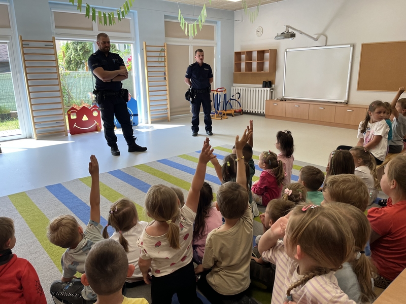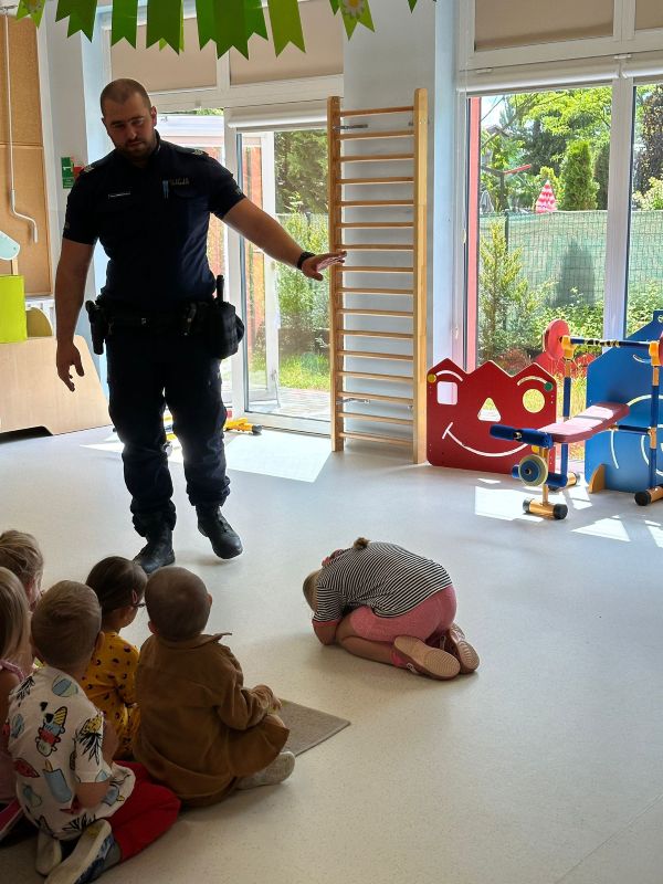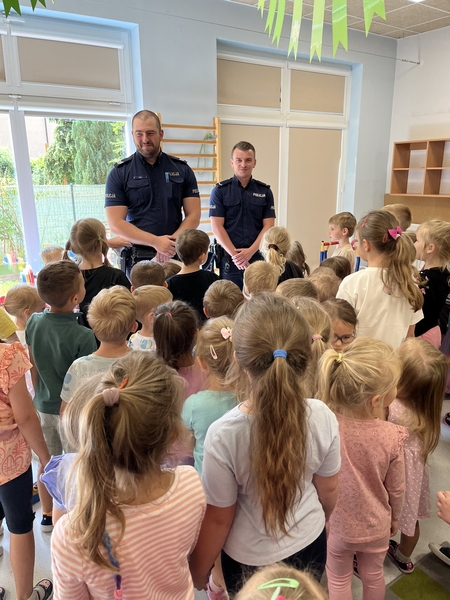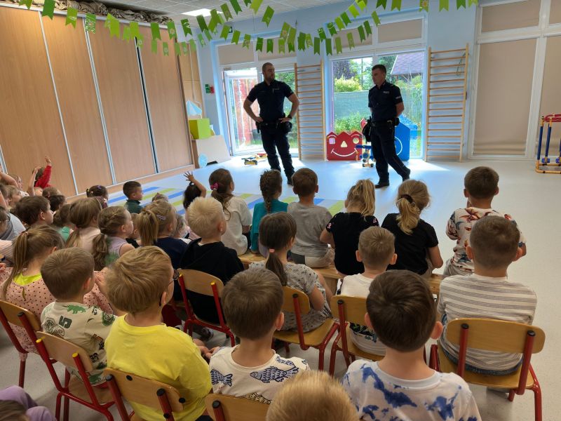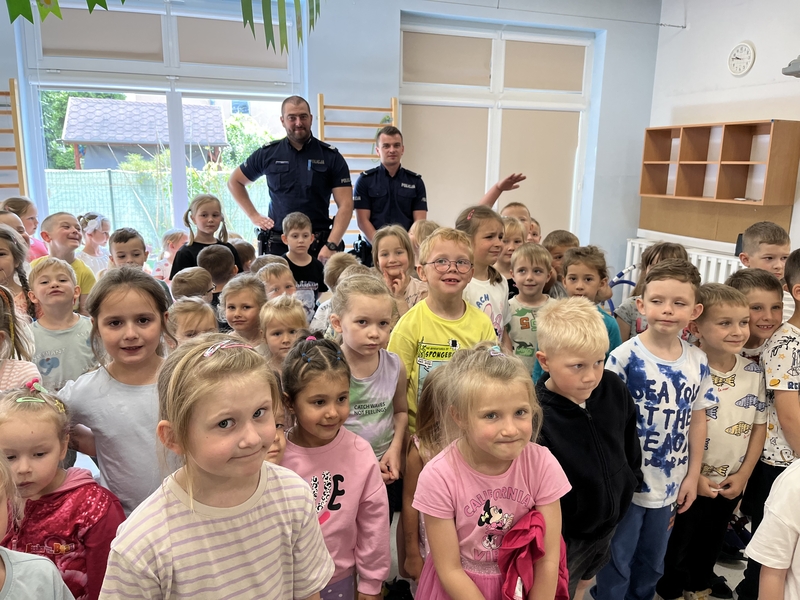 Do „Słonecznej chatki” zawitali policjanci, którzy spotkali się z naszymi przedszkolakami i przedstawili najważniejsze zasady, jak bezpiecznie bawić się i zachowywać na wakacjach. Policjanci byli chętni do udzielania odpowiedzi na trudne pytania przedszkolaków. Przedstawili nam sytuacje przykładowe o tym jak zachowywać się podczas pobytu nad wodą i w górach. Jak zabezpieczać się przed upałem i przestrzegać zasad ruchu drogowego. A co najważniejsze, aby każdy młody człowiek pamiętał o numerze alarmowym 112 oraz, aby w szale zabawy wziął pod uwagę zdanie swoich kochających rodziców! 🙂