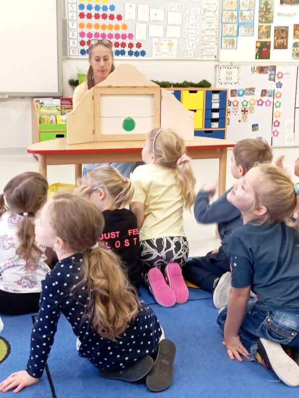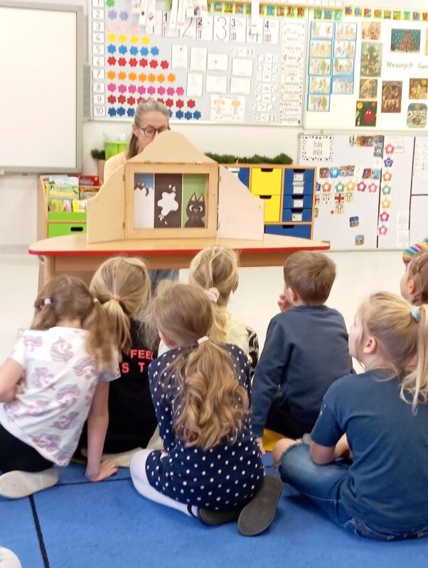 W grupie „Sówki” odbyła się akcja „Czytanie na śniadanie”, zorganizowana we współpracy z Publiczną Biblioteką Pedagogiczną RODN WOM w Częstochowie Filia w Lublińcu. Spotkanie miało na celu promowanie czytelnictwa wśród dzieci oraz pokazanie, że książka może być przyjemnym elementem porannego rozpoczęcia dnia. Pani z biblioteki zaprezentowała dzieciom opowiadanie z wykorzystaniem teatrzyku kamishibai, który wzbudził duże zainteresowanie i zaangażowanie przedszkolaków. Wydarzenie przebiegło w miłej i radosnej atmosferze, rozwijając wyobraźnię, słownictwo oraz pozytywne skojarzenia z książką i czytaniem.