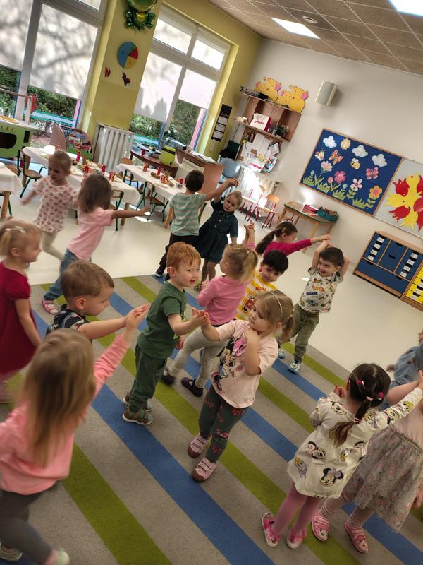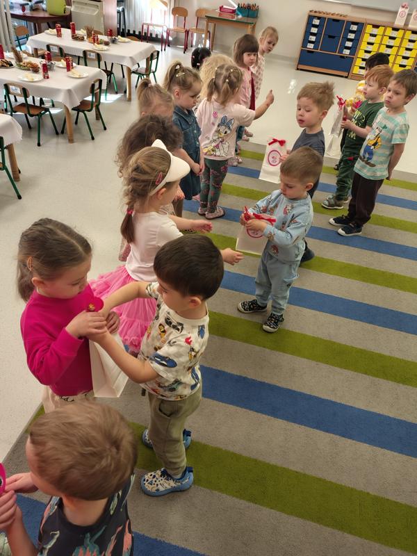 Dnia 9 marca w gr. „Żabki” świętowaliśmy Dzień Kobiet. Chłopcy wręczyli swoim koleżanką drobne upominki, zatańczyli z nimi Menueta i Poleczkę, a kończąc świętowanie zasiedli z koleżankami do poczęstunki. Bardzo miło i sympatycznie spędziliśmy ten dzień.