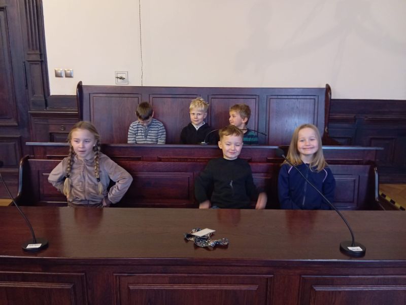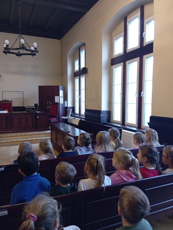 Dzieci miały okazję poznać miejsce, w którym na co dzień podejmowane są ważne decyzje dotyczące przestrzegania prawa i rozwiązywania konfliktów. Podczas wizyty dowiedziały się, jak wygląda sala rozpraw, kim są uczestnicy postępowania sądowego oraz jakie zadania pełnią: sędzia, adwokat, prokurator czy świadkowie.