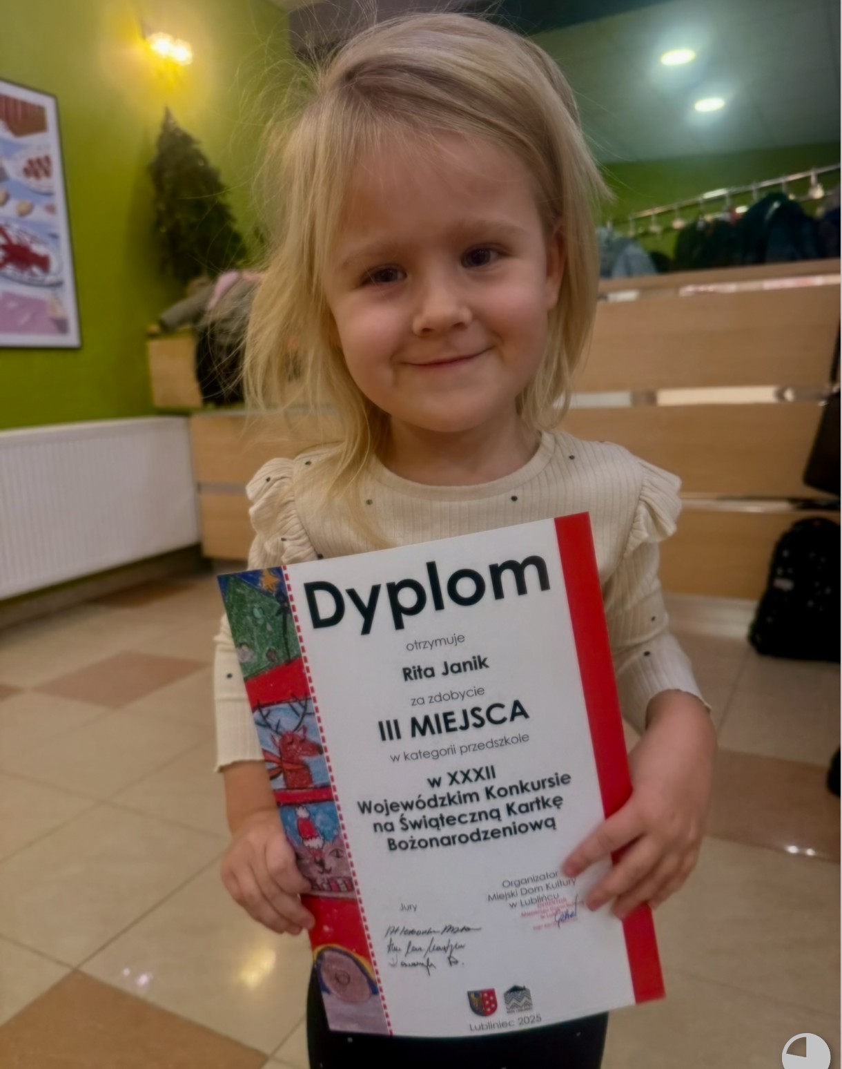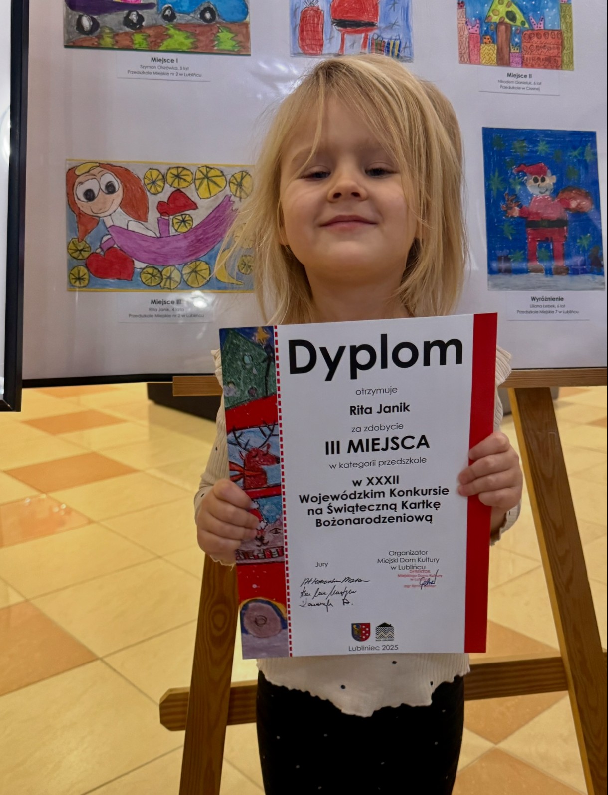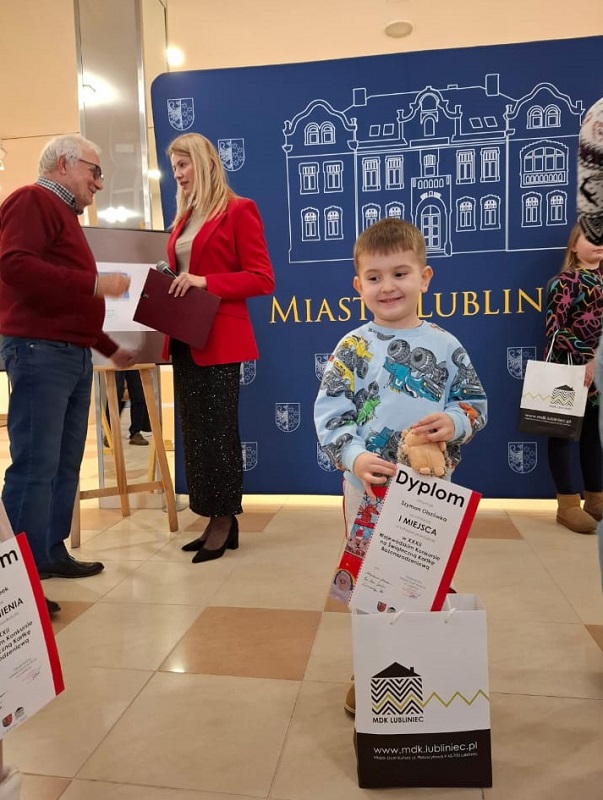 17 grudnia 2025 r. w MDK w Lublińcu odbyła się uroczystość wręczenia nagród w konkursie na Kartkę Bożonarodzeniową. W kategorii: przedszkola dwoje dzieci z naszej grupy zdobyło: