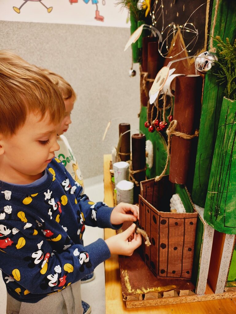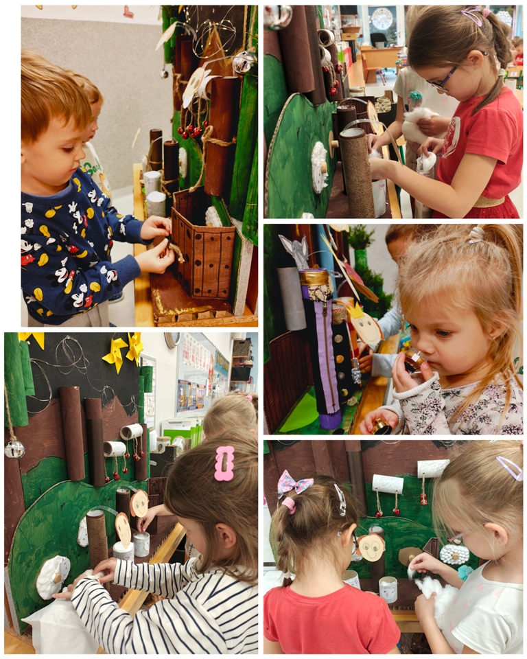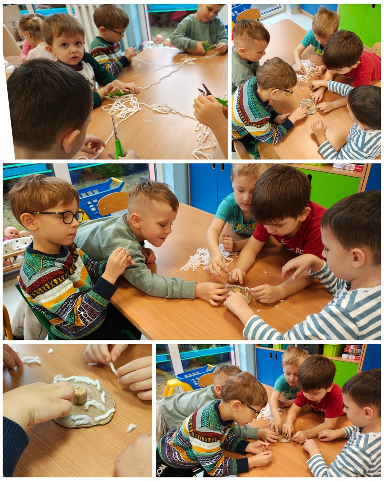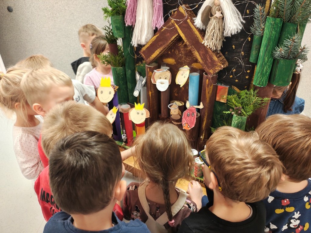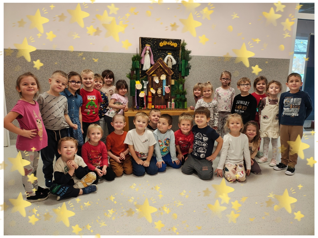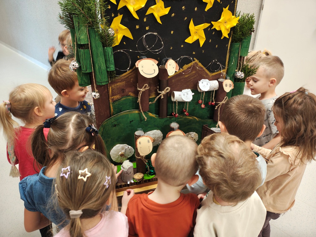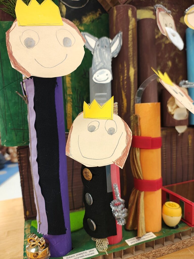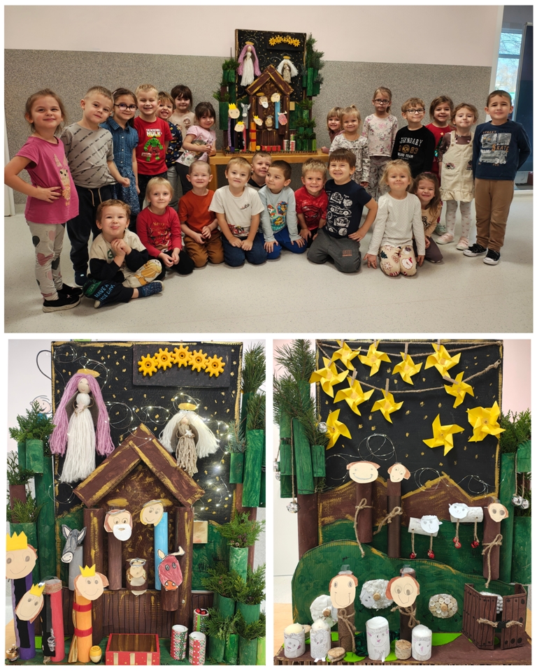 Nasza szopka miała wyjątkowy, sensoryczny charakter – została wykonana z materiałów o różnych fakturach, kolorach i właściwościach, tak aby dzieci mogły ją nie tylko oglądać, ale doświadczać wszystkimi zmysłami. Użyte elementy zachęcały do eksploracji, pobudzały wyobraźnię i w atrakcyjny sposób przybliżały tematykę świąteczną. Dzięki temu tworzenie szopki było nie tylko twórczą pracą plastyczną, lecz także wartościowym doświadczeniem rozwojowym.