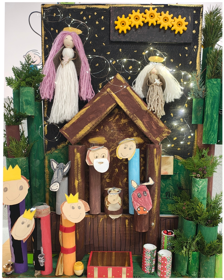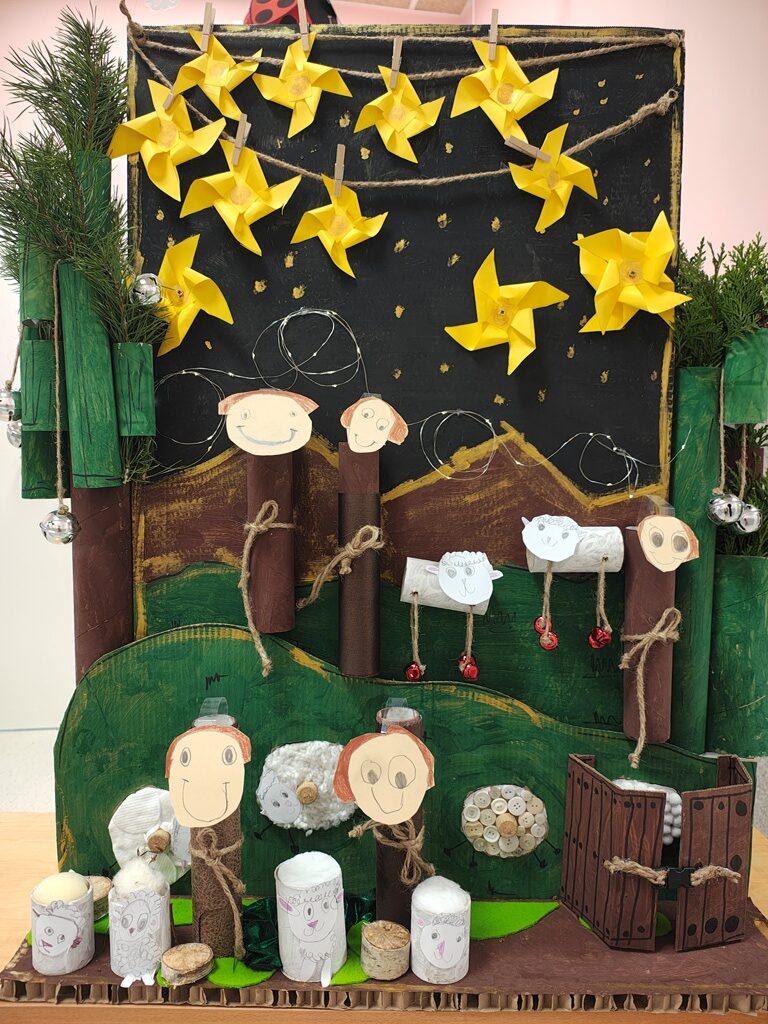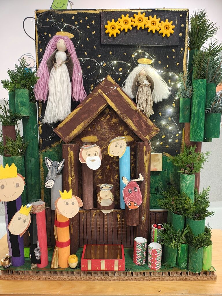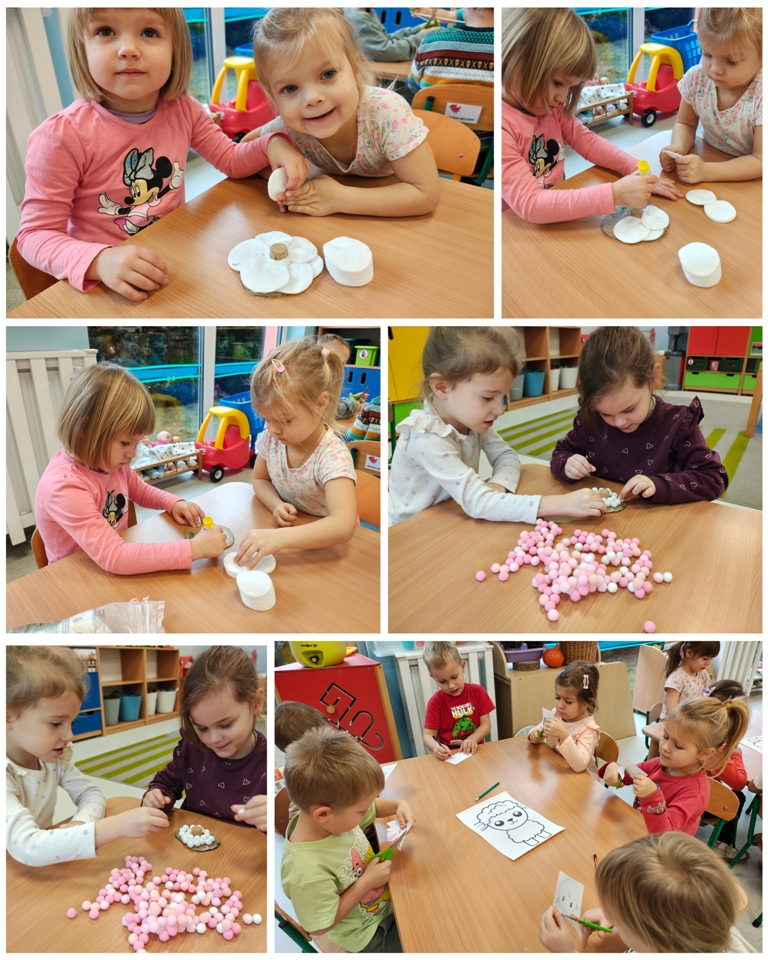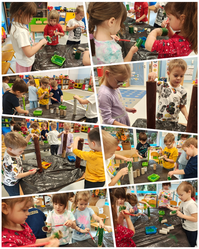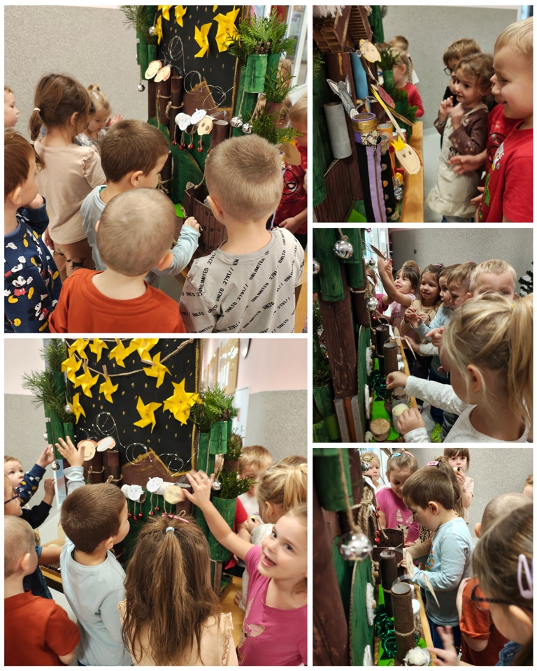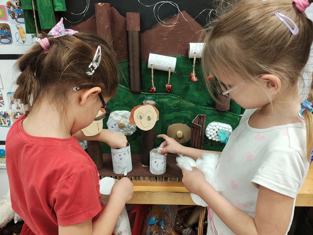 Nasza szopka miała wyjątkowy, sensoryczny charakter – została wykonana z materiałów o różnych fakturach, kolorach i właściwościach, tak aby dzieci mogły ją nie tylko oglądać, ale doświadczać wszystkimi zmysłami. Użyte elementy zachęcały do eksploracji, pobudzały wyobraźnię i w atrakcyjny sposób przybliżały tematykę świąteczną. Dzięki temu tworzenie szopki było nie tylko twórczą pracą plastyczną, lecz także wartościowym doświadczeniem rozwojowym.