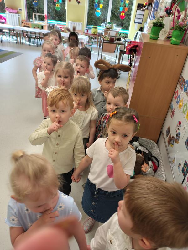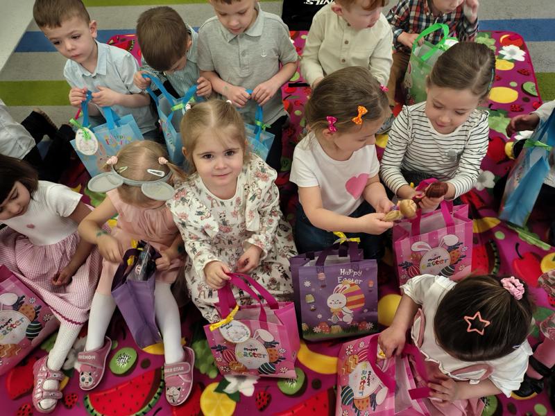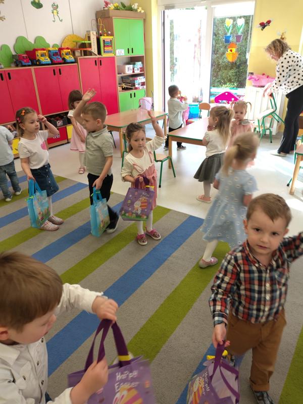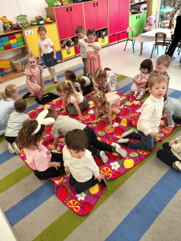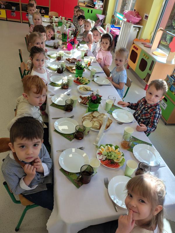 W środę 1.04.2026 r. w naszej grupie „Żabki” odbyło się uroczyste śniadanie wielkanocne. W tym dniu szukaliśmy także świątecznego zajączka, który nie zapomniał zostawić nam prezentów. Otrzymaliśmy także piękny koc na zabawę w piknik od zajączka, który przyniosła nam pani dyrektor. Serdecznie dziękujemy zajączku i nie zapomnij o nas w przyszłym roku.
