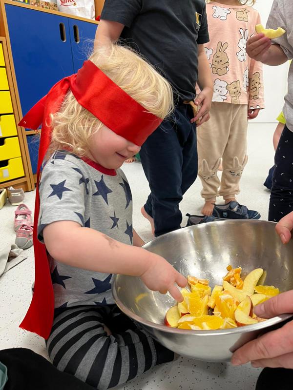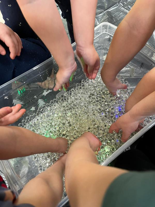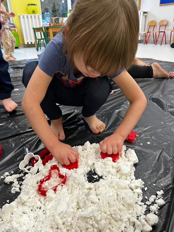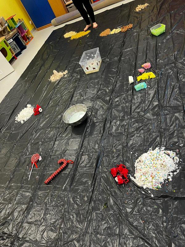 17 grudnia mogliśmy uczestniczyć w zajęciach sensorycznych prowadzonych przez panią Alinę. Pobudzaliśmy zmysły smaku, węchu oraz dotyku. Chodziliśmy bosymi stopami po różnych fakturach np. makaronie, kaszy, orzechach laskowych, jemiole. Mogliśmy pobawić się w cieczy nienewtonowskiej. Popróbować z zawiązanymi oczami różnych owoców.